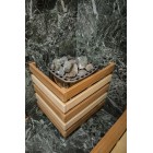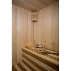 Для обшивки стен сауны выбран абаш, красота которого особенно ярко проявляется при сочетании двух видов древесины: термообработанной, имеющей более темный насыщенный свет, и обычной. Два вида абаша использованы для изготовления банных полков и ограждения печи.