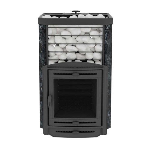 Кожух выполнен в виде сетки из нержавеющей стали и вмещает 300–330 кг камней. Такая масса обеспечивает мощную аккумуляцию тепла и высокую динамику нагрева — парная быстро выходит на рабочий режим и долго удерживает тепло.
